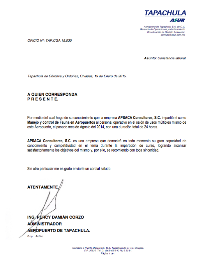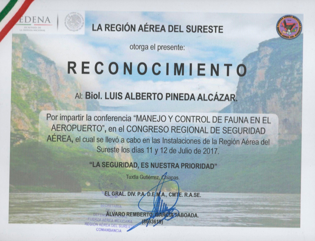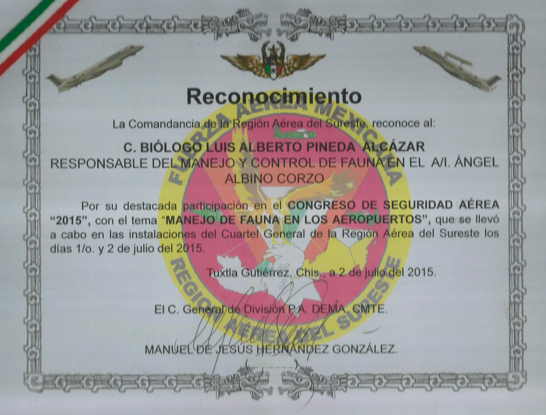 Expositor del curso "Manejo y control de Fauna en Aeropuertos" en el Aeropuerto de Tapachula, S.A. de C.V. - ASUR. Tapachula de Córdova y Ordoñez, Chiapas, 19 de Enero de 2015.