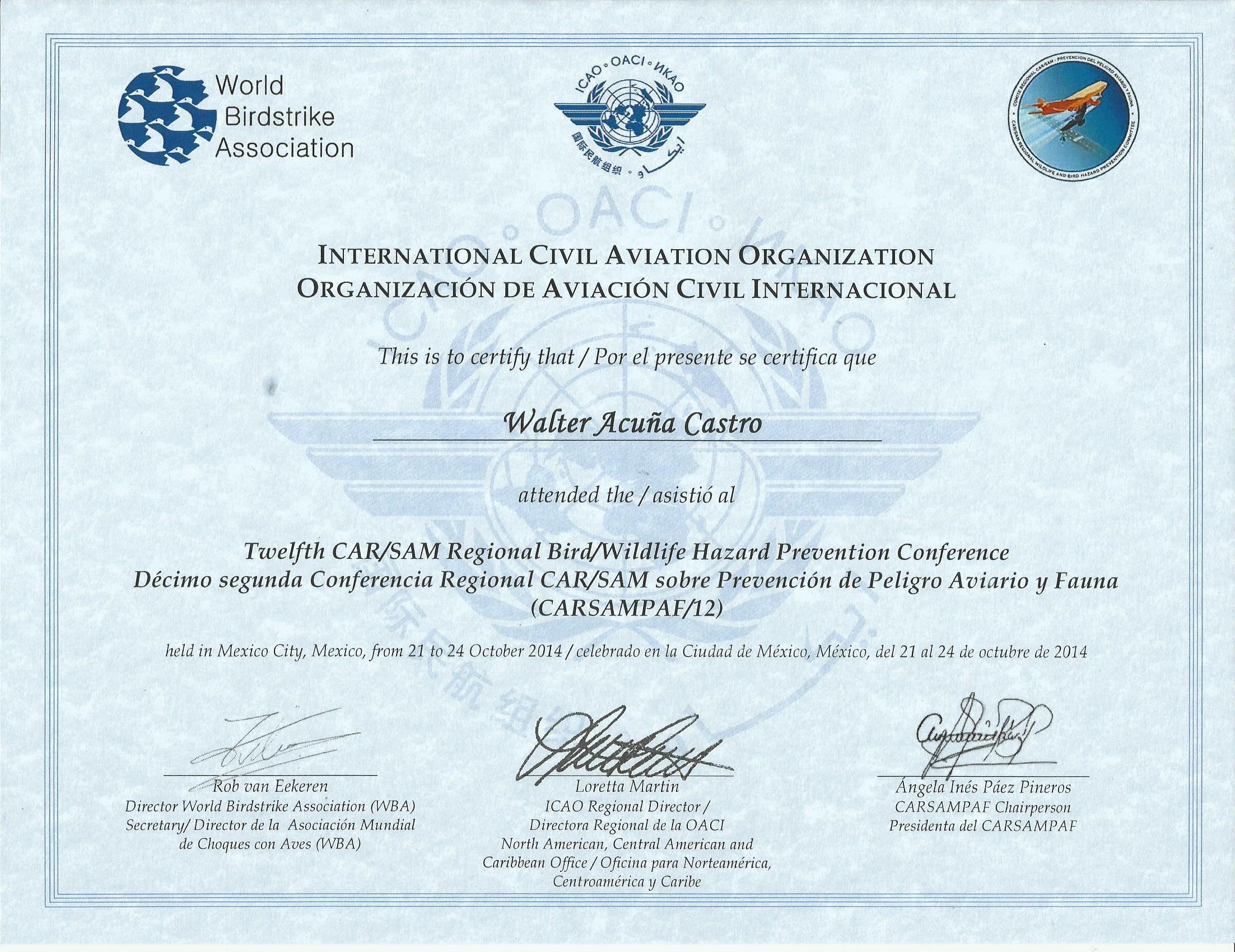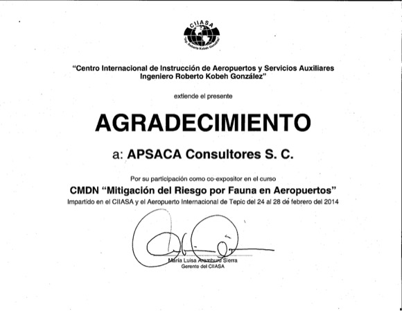 Co-expositor del curso “CMDN Mitigación del Riesgo por Fauna en Aeropuertos”. Centro Internacional de Instrucción de Aeropuertos y Servicios Auxiliares “Ingeniero Roberto Kobeh González” y Aeropuerto Internacional de Tepic. Febrero 2014.